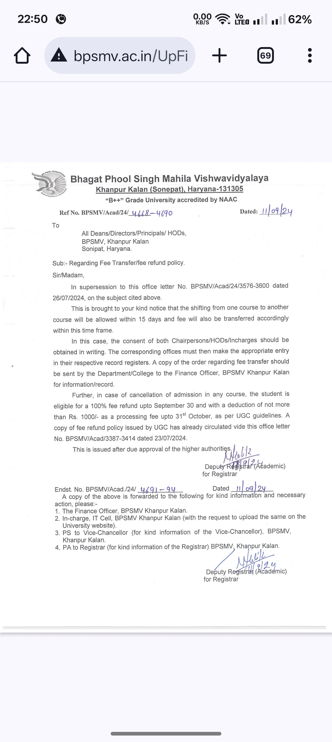 Further, in case of cancellation of admission in any course, the student is eligible for a 100% fee refund upto September 30 and with a deduction of not more than Rs. 1000/- as a processing fee upto 31 October, as per UGC guidelines. A copy of fee refund policy issued by UGC has already circulated vide this office letter No. BPSMV/Acad/3387-3414 dated 23/07/2024.